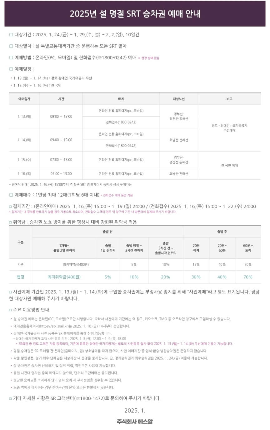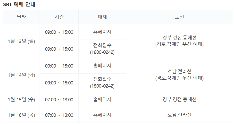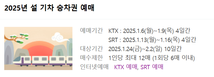 - 예매기간 : KTX : 2025. 1. 6 - 1. 9 / SRT : 2025. 1. 13 - 1. 16